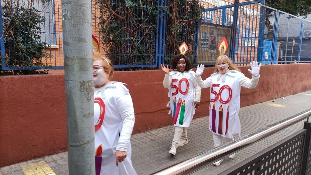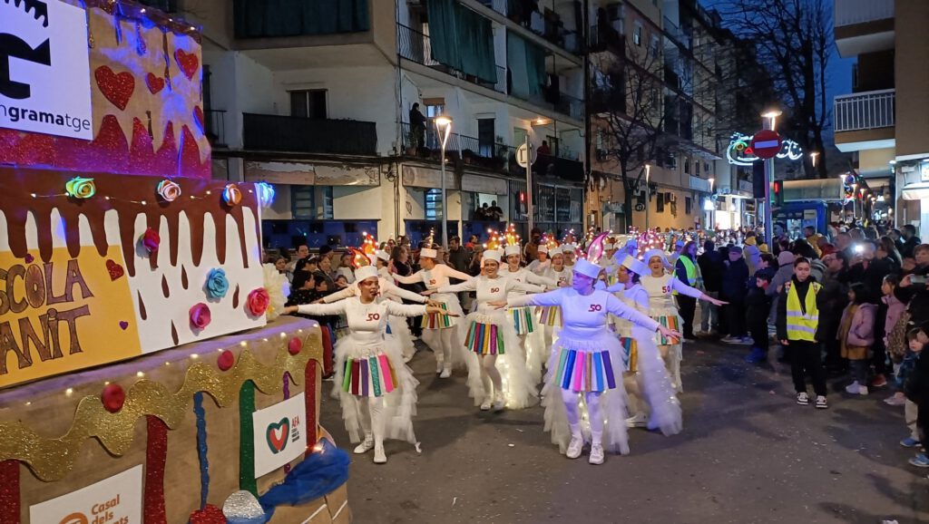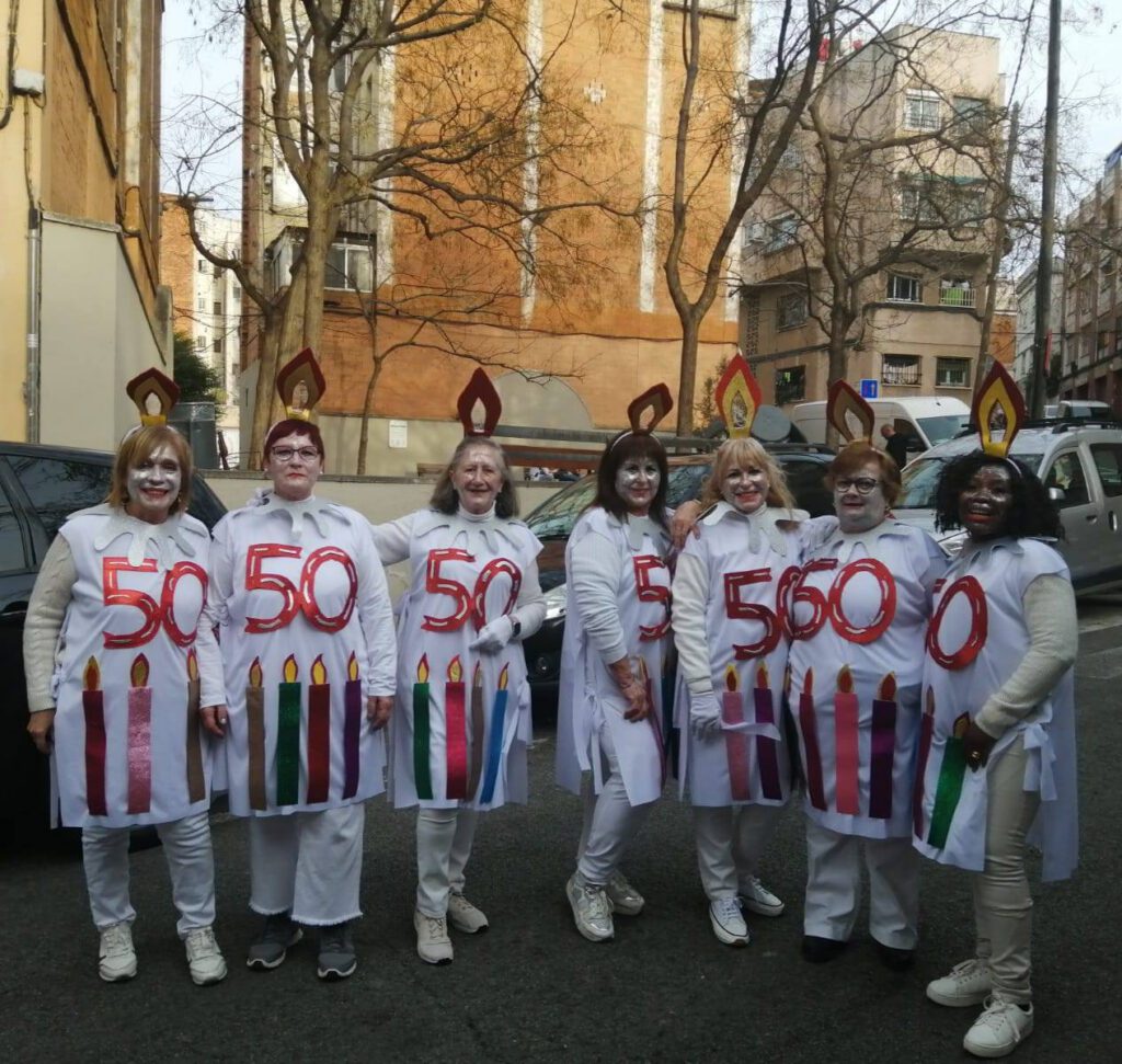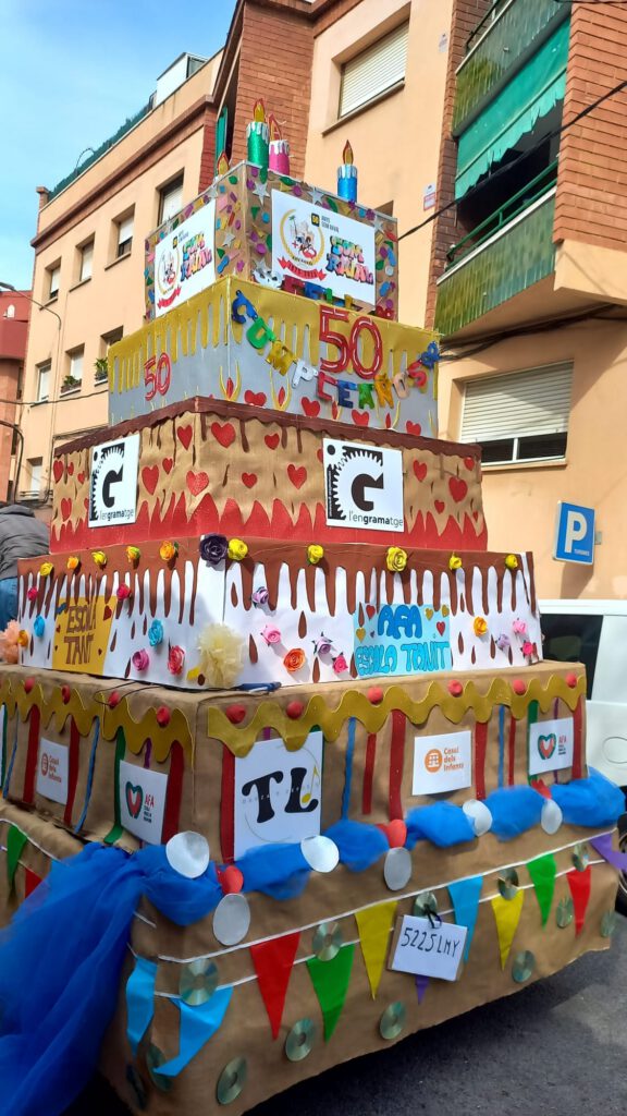 Per a l’ocasió, vam preparar una proposta molt especial: disfresses creades col·laborativament i una carrossa temàtica en forma de pastís d’aniversari, símbol perfecte per celebrar aquests 50 anys d’història compartida. Durant un mes i mig, veïns i veïnes de diferents edats es van implicar en tot el procés: des del disseny i la preparació dels materials fins a la confecció de vestuari, el muntatge de la carrossa, l’organització del grup i els assajos previs.